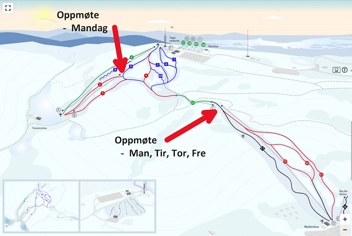 Oppmøtet er alltid på toppen av heisen man skal ha trening på den gjeldende dagen. Vi anbefaler også at U16 løpere følger vårt helårs ski og barmarks opplegg, som passer bra for både de som "bare vil ha det gøy på trening" og "fremtidens verdensmester".